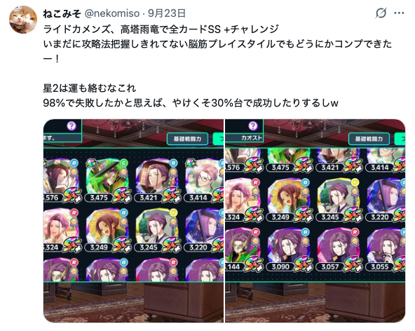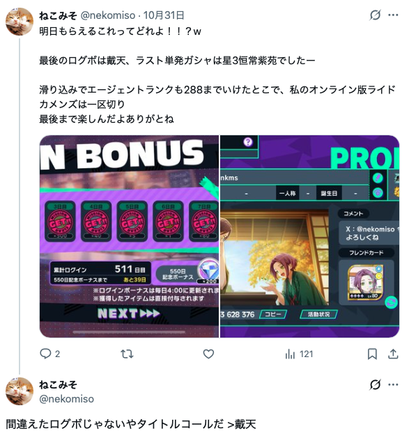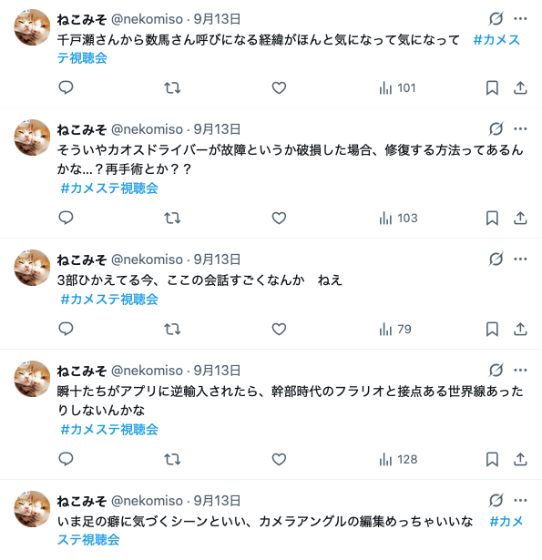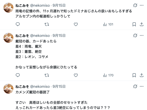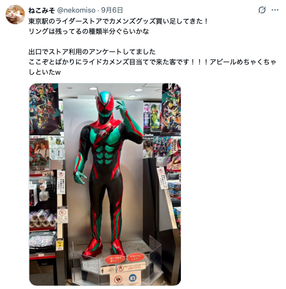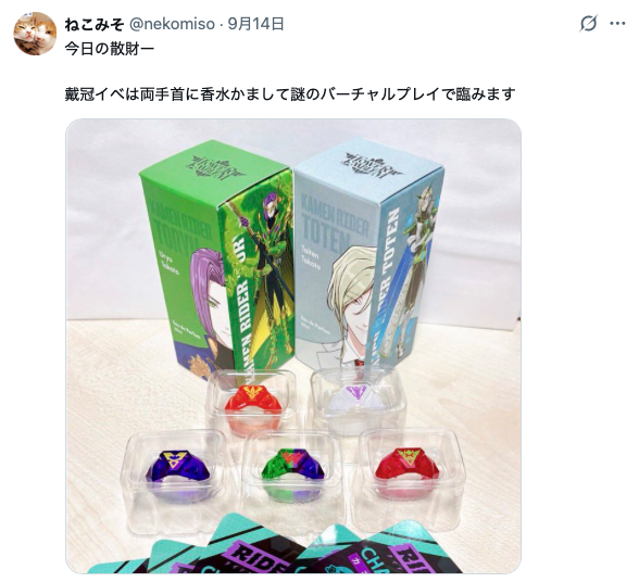 ・ライドカメンズに関する感想雑文あれこれ置き場 ・10/1なっちゃったので、とりあえず見切り発車で随時感想ぶんなげ予定 ・ネタバレ要素はこんなネタバレ【ネタバレ】畳む感じで隠します ・特撮知識は主に昭和〜平成初期ぐらいまで ・ライダー作品でリアタイ視聴はBlack、龍騎、鎧武 ある程度形になったらメインサイトから繋げますー 普段はここ でなんか言ってます 2025.10.1(Wed) 00:41:28 この場所について